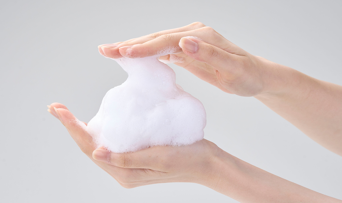 手のひらで泡立ててから髪へなじませ、洗うときは頭皮をやさしくマッサージするように