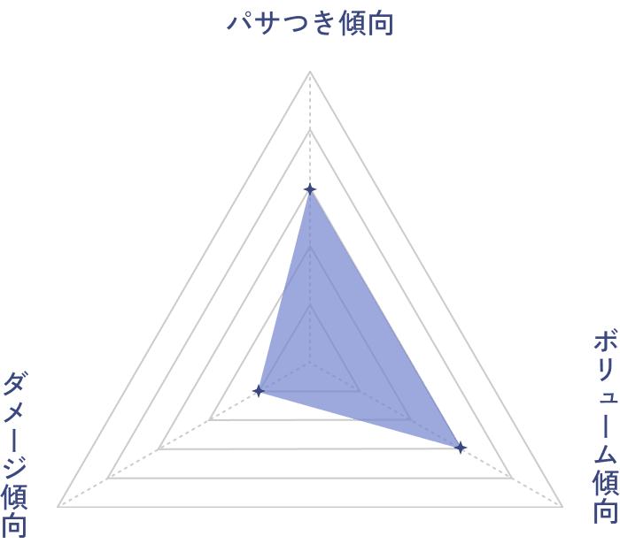 乾燥による軽いパサつきが気になる髪質です。適度なうるおいを与えることで、自然なツヤとまとまりを目指せます。軽やかなオイルを日常的に取り入れて、こまめな乾燥ケアを続けるのがおすすめです。
