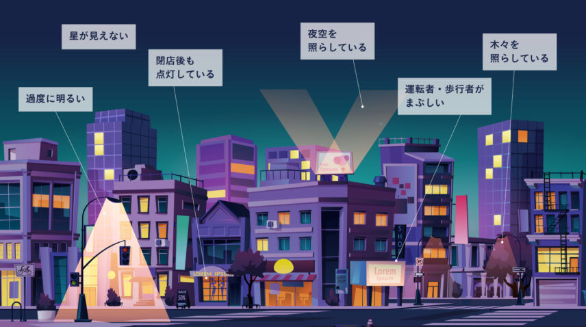 光害とは、人工の光から生じる様々な問題を呼びます。光害は可視光などでの天文観測を阻害するだけでなく、眩しさ等の不快感、交通信号等の重要情報を認知する力の低下、野生動植物や農作物等への悪影響等が生じており、その早急な軽減が求められています。